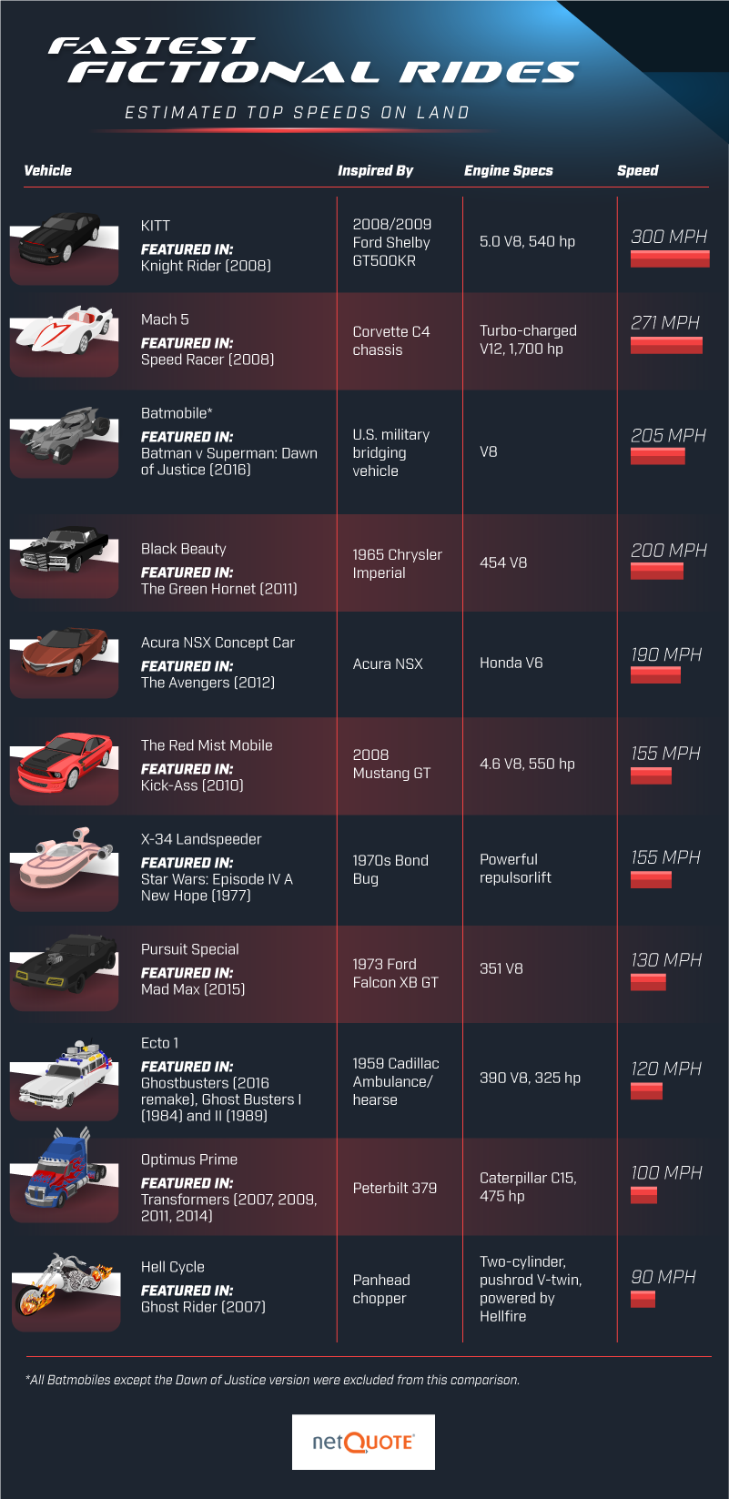 Some fans may say this is debatable. The Mach 5 is a close second at 271 miles per hour, followed by the “Dawn of Justice” Batmobile at 205 miles per hour and Black Beauty at 200 miles per hour.