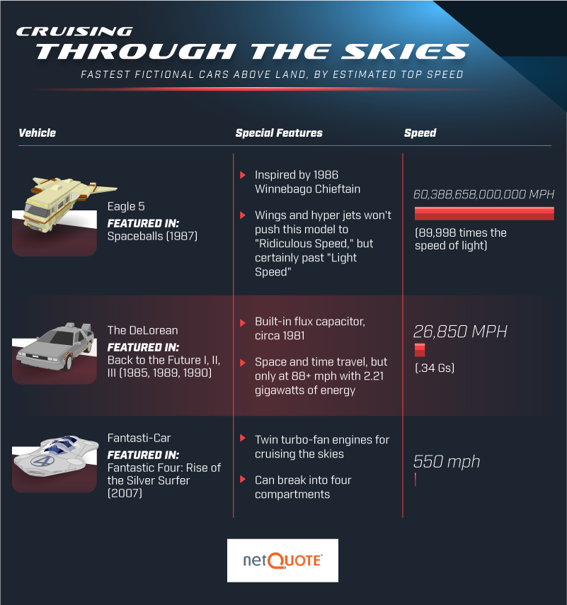 Batmobile fans out there, it is time to broaden your horizons. There are plenty of fictional rides, past and present, to consider. And your travel routes are limitless: whether you want to stay on the ground or fly high above the clouds.