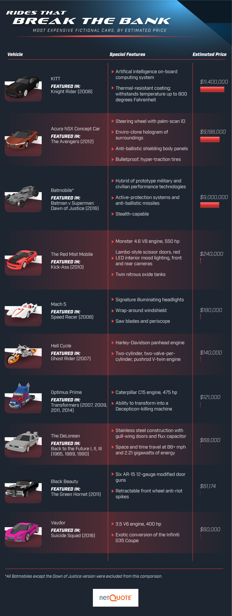 Not far behind is the “Dawn of Justice” Batmobile, which cost Bruce Wayne a cool $9 million. From there, the costs of the rides fall off, down to a lowly $240,000 for the Red Mist Mobile, $180,000 for the Mach 5, $140,000 for the Hell Cycle, and $121,000 for Optimus Prime.