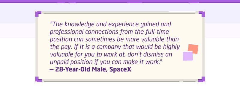 As far as the highlights and horrors of internships of all kinds, respondents were most likely to prize hands-on experience. Forty-one percent described face-to-face experience in their desired field as the best part of their internship, and another 14 percent said the highlight was acquiring valuable skills. Of course, pay (or lack thereof) was commonly cited as a major downside of the experience. Twenty-three percent of respondents identified the compensation as the worst part of their internship.