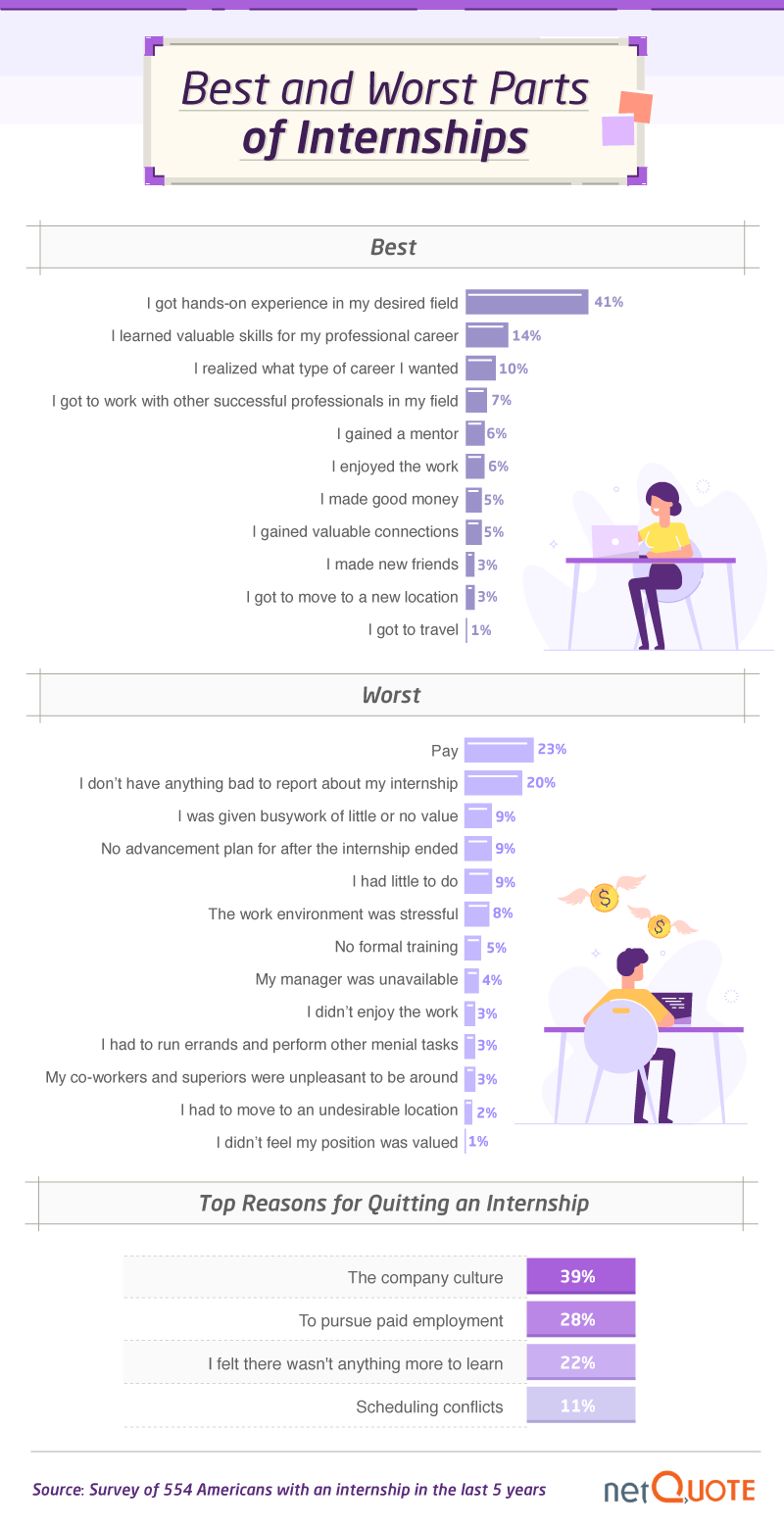 Although our study found that just 10 percent of people quit their internships, 28 percent of those who quit left to pursue a paid opportunity instead. Another common justification for quitting was the sense that they had learned all they could from the experience. This finding resonates with common intern frustrations, including doing work of little consequence or having little to do at all. For these reasons, experts recommend that companies create internship opportunities with clear goals and frequent supervision, lest interns flounder without defined responsibilities.
