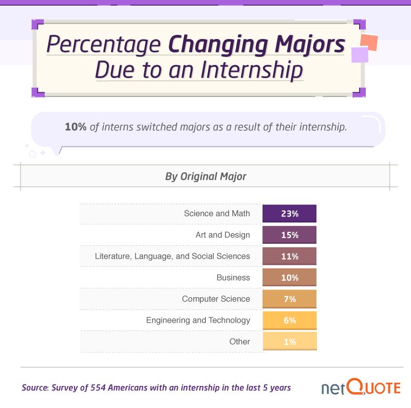 Theoretically, internships are a useful opportunity to refine one’s academic focus, presenting the real-world applications of subjects studied in school. But that experience can also convince students to shift their majors entirely: Ten percent of respondents reported changing their academic concentration following an internship experience. Perhaps some students realize they would rather not work in a field they previously aspired to enter. Conversely, other interns may discover a more appropriate area of study to support their professional goals.
