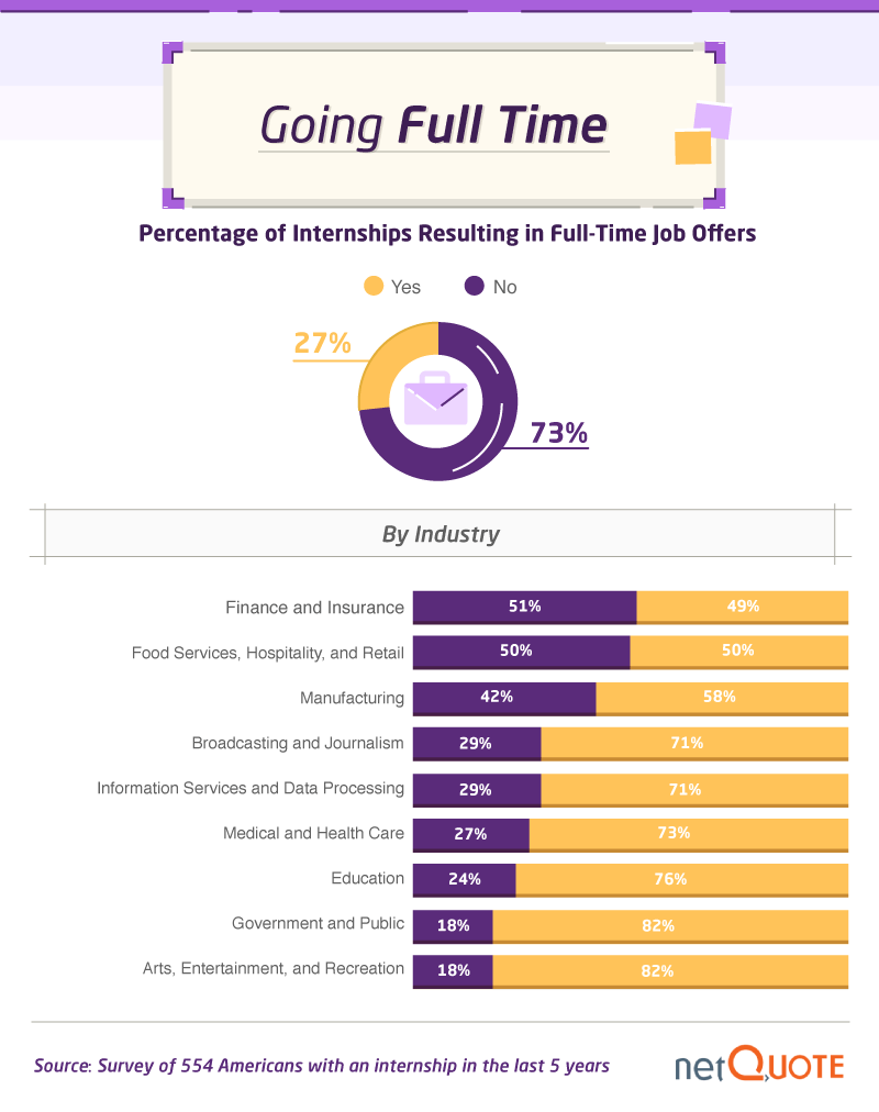 For many, the ideal internship outcome is an offer of employment, either immediately or upon graduation from school. Unfortunately, our findings suggest nearly 3 in 10 interns receive such invitations to join the team. In some industries, however, the outlook was far brighter: In the finance and insurance fields, a high rate of intern hiring reflects extensive recruiting operations. For major accounting, consulting, and investment firms, an annual influx of eager college grads is an integral part of their business model.