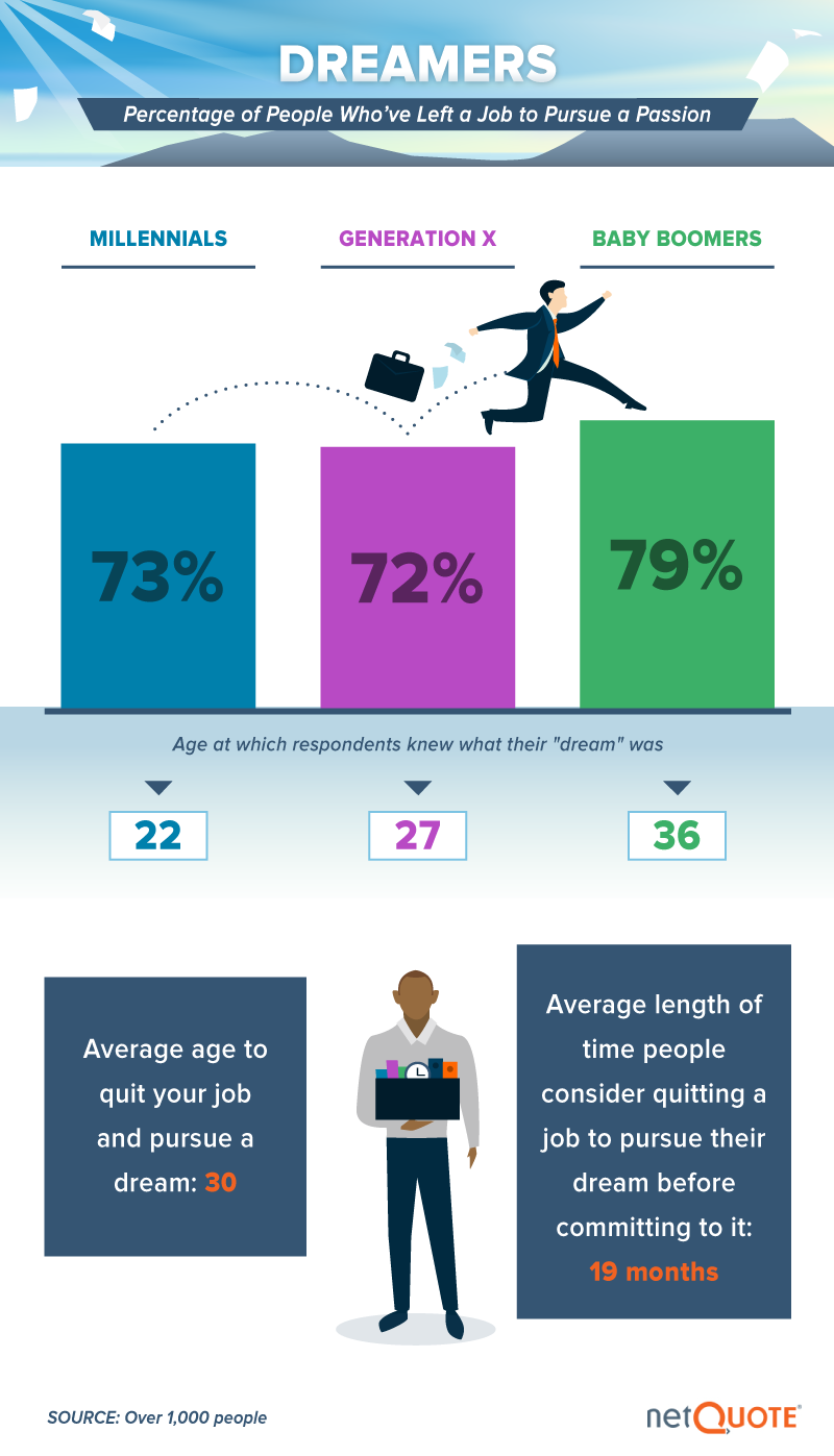 According to our findings, the attraction of a dream job speaks to Americans young and old alike. Among millennials, Gen Xers and Baby Boomers, more than seven in 10 respondents had left a job to pursue their passions. Interestingly, millennials seemed to recognize their ideal profession earlier in life than older generations did. Baby Boomers, who didn’t find their true calling until age 36 on average, might suggest millennials are too young to know their true callings in their early 20s.