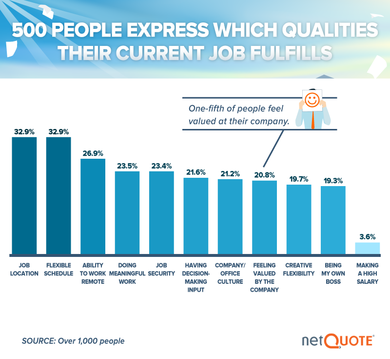 Nearly a third of respondents said their current jobs had a good locations, a perk some experts say keeps talented workers in lousy jobs. Roughly the same percentage appreciated their employer’s flexible scheduling. Additionally, more than a quarter of respondents said they possessed the ability to work remotely – reflecting the vast increase in telecommuting opportunities since the turn of the century. It’s easy to see what these advantages have in common: They emphasize convenience rather than passion.
