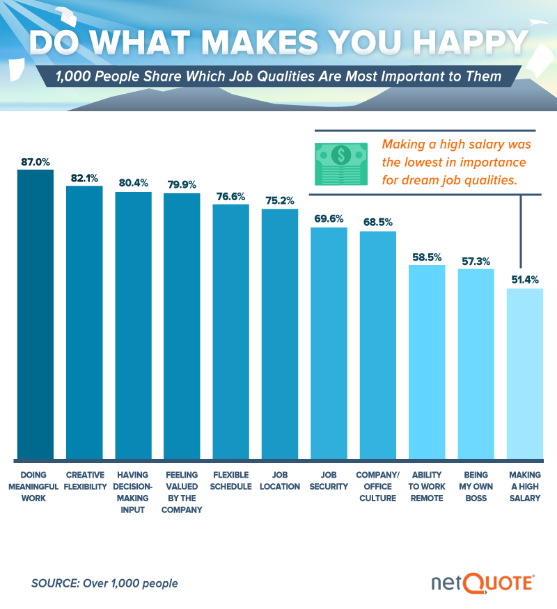 87 percent of our participants said their dream jobs would entail meaningful work, an ideal that all age groups share according to previous research. Creative flexibility was the second-most cited dream job characteristic, though some experts suggest creativity lies more in the ways we conceive of our work than what it actually entails. Other common dream jobs features seemed more to do with professional impact and authority: Roughly eight in 10 respondents said wanted to feel valued and have decision-making power.
