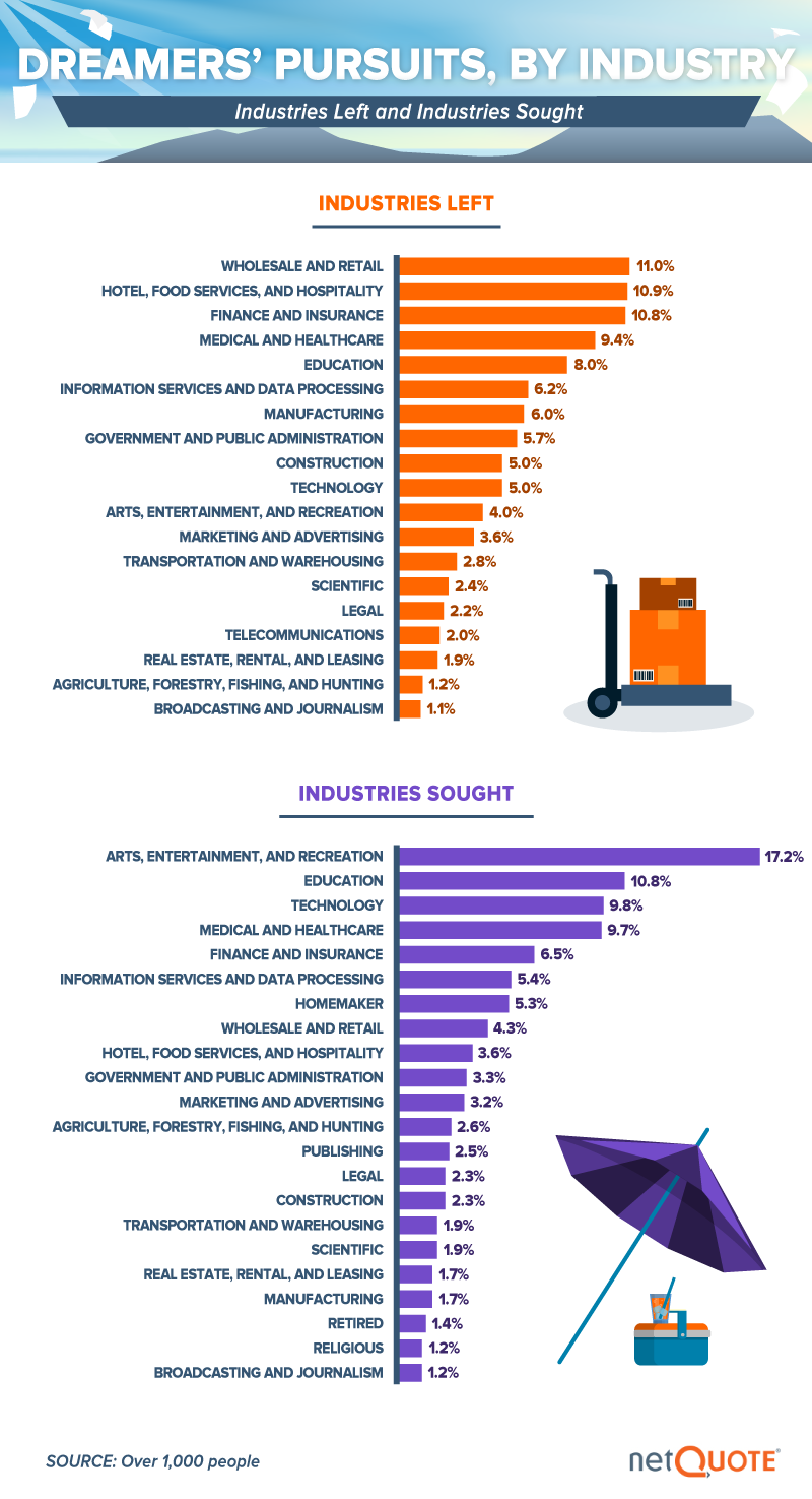 Among those who do take the plunge and pursue the employment of their dreams, which fields are they leaving – and seeking? Retail and wholesale positions had the greatest rate of attrition; experts attribute high turnover in those fields to the repetitive nature of the work. A similar percentage left jobs in the food service and hospitality sector, perhaps to to the stress endemic in that industry. Former finance and insurance professionals also made the leap quite often, possibly to the benefit of their wellbeing. Recent studies have shown high rates of mental ill health in that sector.