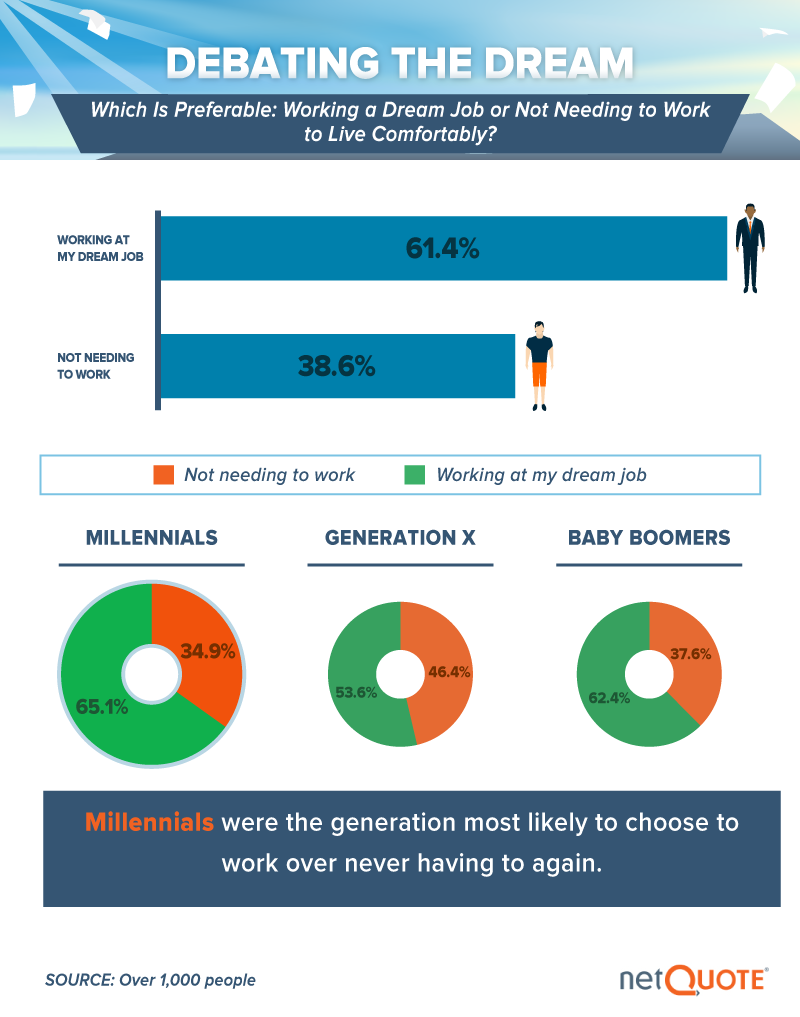 Research has repeatedly shown that unemployment correlates with unhappiness, but the prospect of not needing to work still sounds pretty enticing to some Americans. In fact, 38.6 percent of respondents said they’d prefer not working at all to employment in their dream job – if they could live comfortably without it. This sentiment was strongest among Gen Xers, who are presumably decades away from retirement in most cases. Interestingly, 62 percent of Baby Boomers chose their dream jobs over taking it easy. Perhaps seniors are working later in life than ever before for more reasons than money.