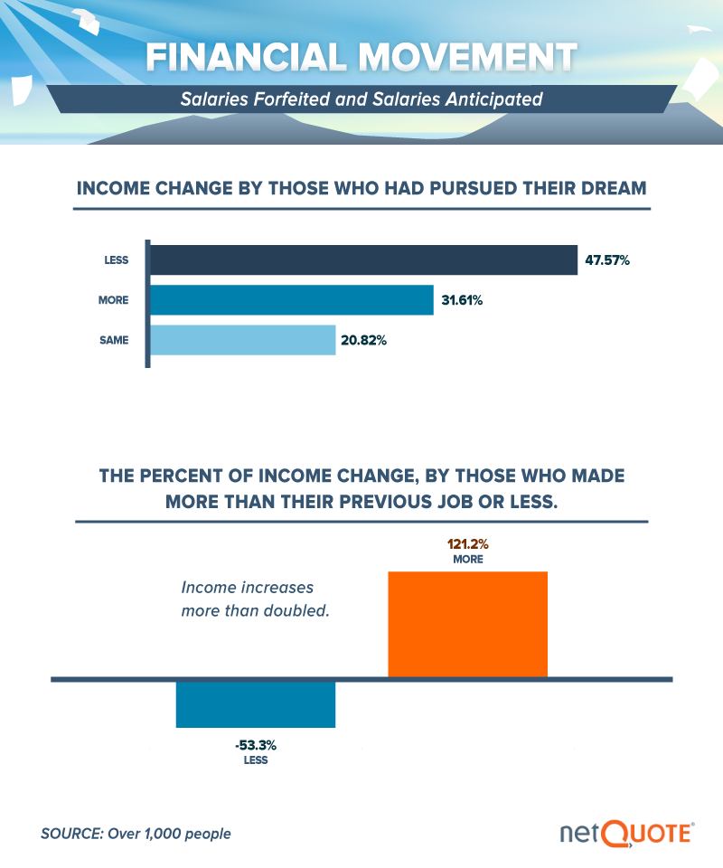 But just how much less were they earning? What we found was that on average, if one is ends up making less pursuing their dream, they cut their salaries in half. However, on the flip side, if you end up making more than your previous salary, people report making over 120% more than in their previous jobs.