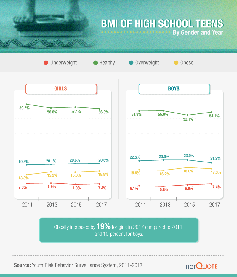 Since 2011, there’s been around a 10 percent increase in obesity among boys and a 19 percent increase in obesity among girls in high school. According to the YRBSS, only 56 percent of teenage girls and 54 percent of teenage boys qualified as having a healthy weight in 2017. While roughly 7 percent of the remaining teens were classified as being underweight (which poses an entirely different set of health concerns), more than 1 in 3 boys and girls were identified as being either overweight or obese in 2017. In both cases, boys had a higher rate of obesity (over 17 percent) and being overweight (21 percent).