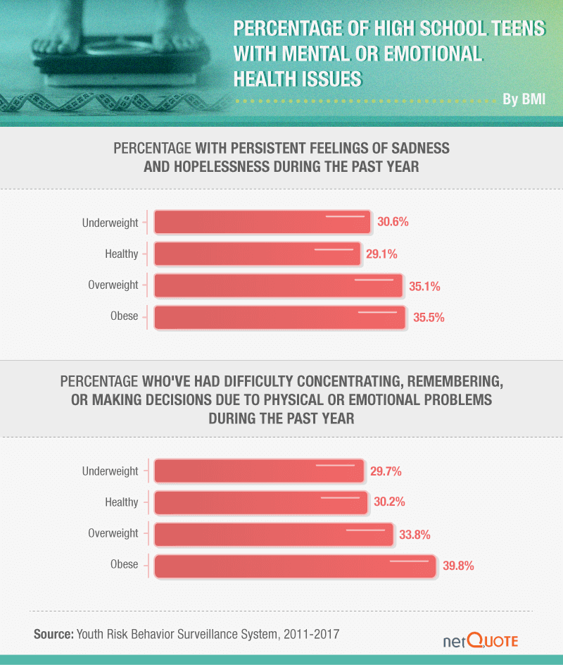 Overwhelmingly, teenagers who were either overweight or obese were more likely to admit feeling sad or hopeless every day for long stretches of time to the point that their daily routines suffered as a result. Compared to 29 percent of healthy teens and 30 percent of underweight teens, more than 35 percent of overweight and obese high school-aged children experienced this level of emotional trauma.