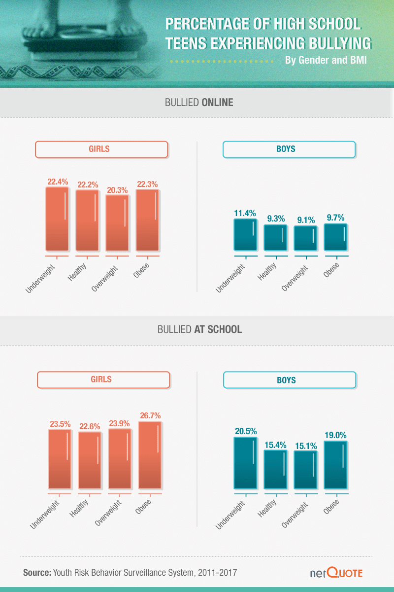 Regardless of their weight or size, more than 1 in 5 teenage girls experienced digital or face-to-face bullying while in high school. Still, among teenage girls, cyberbullying and harassment at school were much more common among obese children than those who were underweight. Among teenage boys, we found bullying was most common for those who were underweight instead.