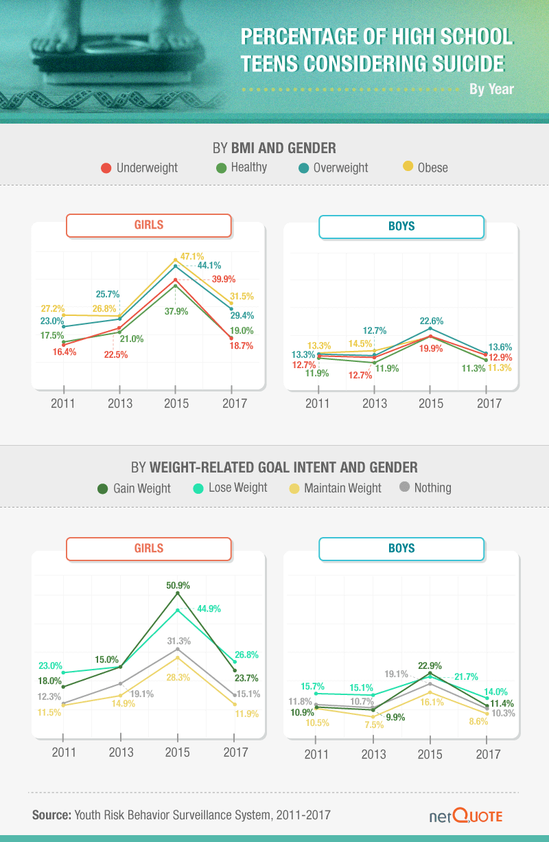 According to the CDC, children with obesity can suffer from long-term social and emotional consequences. According to our research, teenage girls who were obese expressed thoughts of suicide more so than their overweight and underweight peers. The spike in thoughts of suicide in 2015 reflect a phenomenon researchers are reporting as the highest surge in suicide in nearly 30 years, affecting women most acutely, and significantly, girls ages 10 to 14 years old. In both girls and boys, those in the healthy BMI category considered suicide the least for most years.
