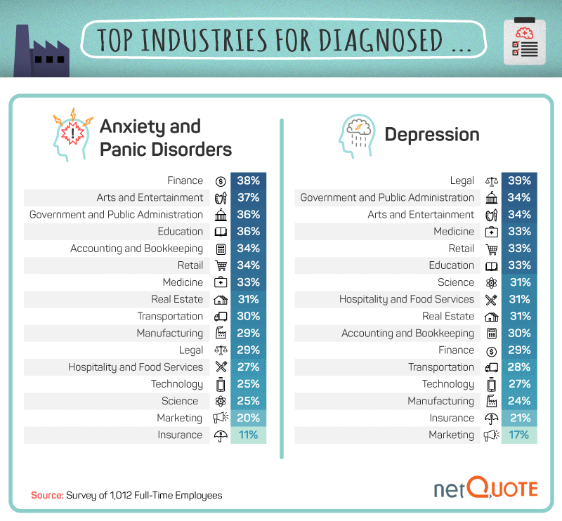 The industries whose employees suffer from each differ, though. Finance was the leading industry when it came to anxiety and panic disorders, with 38 percent of full-time employees receiving a diagnosis at some point. The legal field saw the highest rate of depression, with 39 percent of employees diagnosed. Arts and entertainment along with government and public administration, however, ranked high for both anxiety and panic disorders and depression. On the other side, marketing and insurance had the lowest rates of diagnosed anxiety and depression.