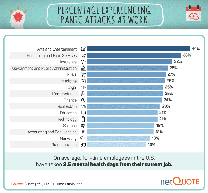 Those with psychological disorders, specifically ones falling under or related to anxiety, often experience panic attacks. However, many people who are not diagnosed or don’t meet the criteria for diagnosis also experience panic attacks. Panic attacks can occur in any situation, despite the presence of an actual threat. Employees in arts and entertainment experienced the highest rate of panic attacks at work, followed by hospitality and food services. While panic attacks can occur without warning, these fast-paced environments may add to the likelihood of a panic attack taking place on the clock.