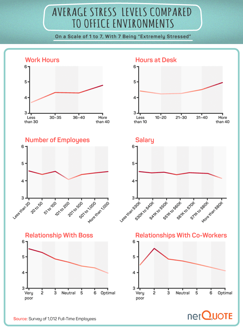 Average stress levels stayed pretty steady across all salaries, though it may be counterintuitive to think that additional income doesn’t relieve stress. Good relationships actually may be the link to happiness at work, though. The more optimal the relationship between employee and boss or co-worker, the less stress one felt. Poor relationships were the only factor where stress levels neared a 6 on our scale.