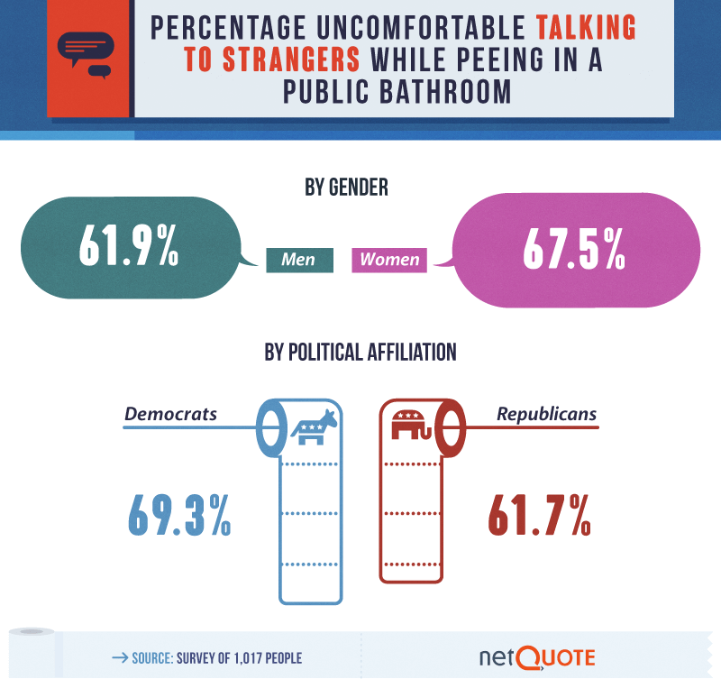 The bathroom is no exception, but it might be slightly worse for women compared to men. Of those surveyed, nearly 68 percent of women were uncomfortable talking to strangers while peeing in a public bathroom. And just because men aren’t offered the same level of privacy as women in most public restrooms doesn’t mean they’re OK with striking up a conversation in the middle of the act, either. Close to 62 percent of men felt awkward talking to a stranger while using the restroom.