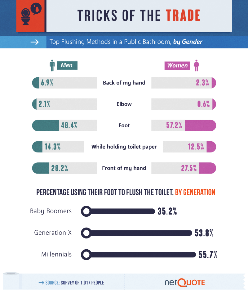 While roughly 28 percent of men and women kept things simple by using their hands to flush public toilets, others got much more creative. Around 57 percent of women and 48 percent of men used their feet to flush the toilet, while another 13 percent of women and 14 percent of men grabbed a piece of toilet paper first before touching the handle. Concerns over bathroom cleanliness could be rising with each passing generation, too. Millennials (almost 56 percent) were more inspired to flush with their feet compared to Gen Xers (nearly 54 percent) or baby boomers (35 percent).