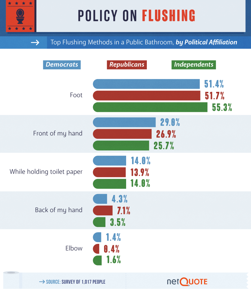 Over half of the people surveyed (including 55 percent of Independent voters and 51 percent of both Democrats and Republicans) used their feet to flush public toilets. A few brave souls, including 29 percent of Democrats and 27 percent of Republicans weren’t worried about flushing the toilet with their hands, although roughly 14 percent of each political affiliation used toilet paper to flush. In either case, it’s always best to wash your hands if you want to avoid picking up bacteria from a communal bathroom.