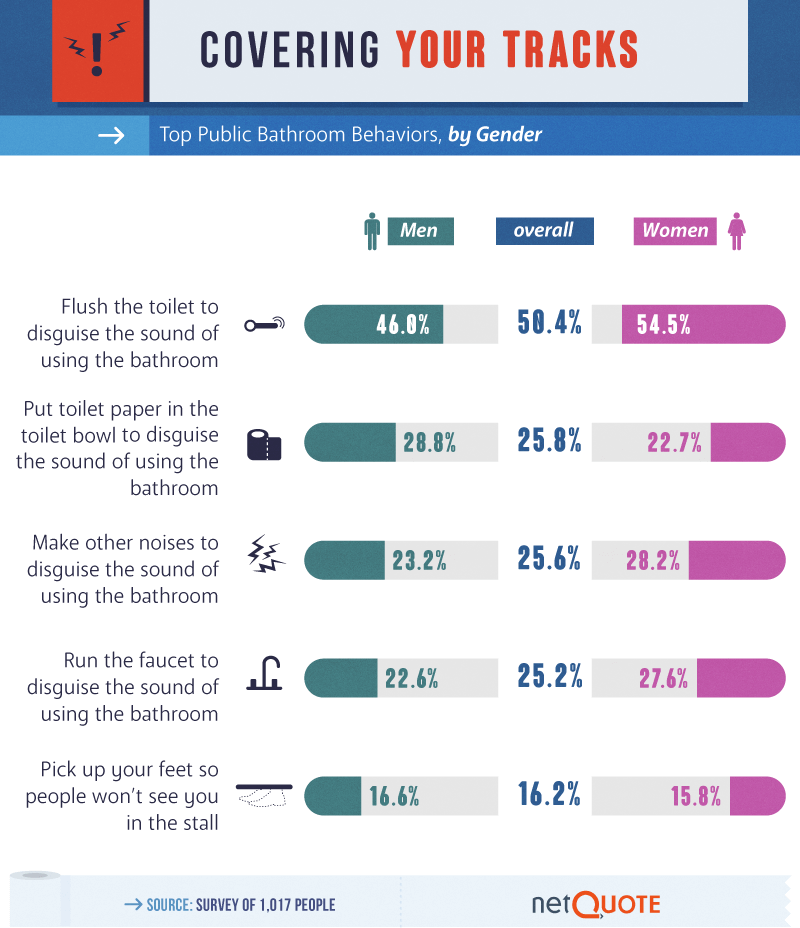 Need something even more distracting? We found it’s not entirely uncommon for men and women to make other noises (like coughing), and 1 in 4 people confessed to running the faucet while on the toilet.