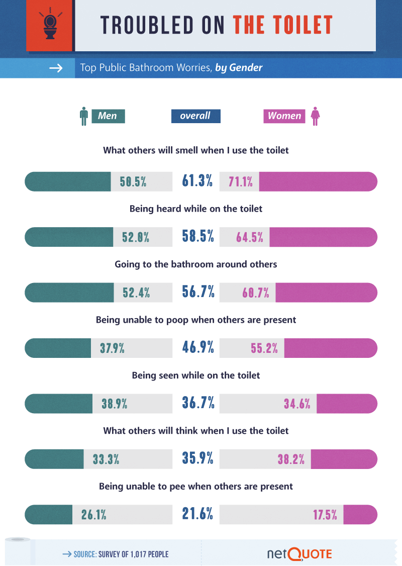 Over 52 percent of men and nearly 61 percent of women said they were embarrassed by going to the bathroom around other people, and almost 47 percent of people admitted they couldn’t poop when other people were present.