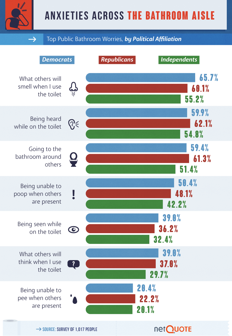 Compared to 55 percent of Independent voters and 60 percent of Republicans, nearly 66 percent of Democrats worried about what other people smelled when they used a public bathroom. Conversely, 62 percent of Republicans were concerned with being heard on the toilet, followed by just under 60 percent of Democrats and 55 percent of Independent voters.