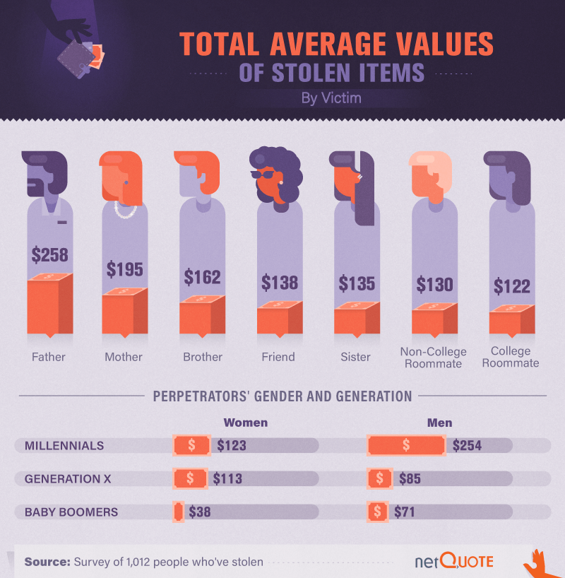We know sisters are stolen from more than brothers and mothers more than fathers, but this doesn’t mean sisters and mothers get hit the hardest by in-home thieves. In fact, the average value of the items stolen from brothers outweighed items stolen from sisters, and fathers had the biggest financial hit when it came to money and items stolen. The average value of items stolen from dads was $63 more than the cost to the next highest victim (mothers).