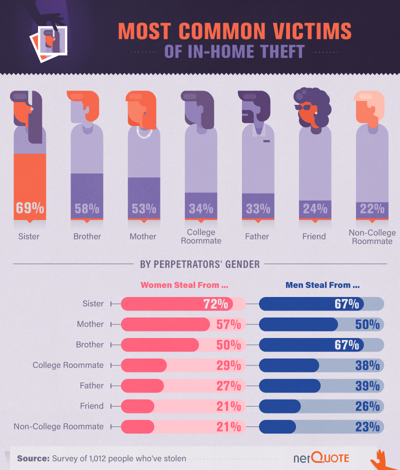 Who are the victims of these in-home thefts? By and large, sisters were the most likely to be burglarized by family or friends. Women were the most likely to steal from their sisters than anyone else, but men were equally likely to steal from a brother as they were a sister. Women, on the other hand, would steal from their mother before they’d poach something from a brother.