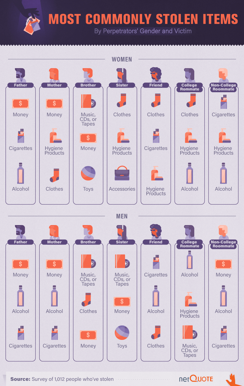 When stealing from their male relatives and acquaintances, women were more likely to go after money and entertainment. They often stole alcohol from their fathers and non-college roommates but only took cigarettes from friends.