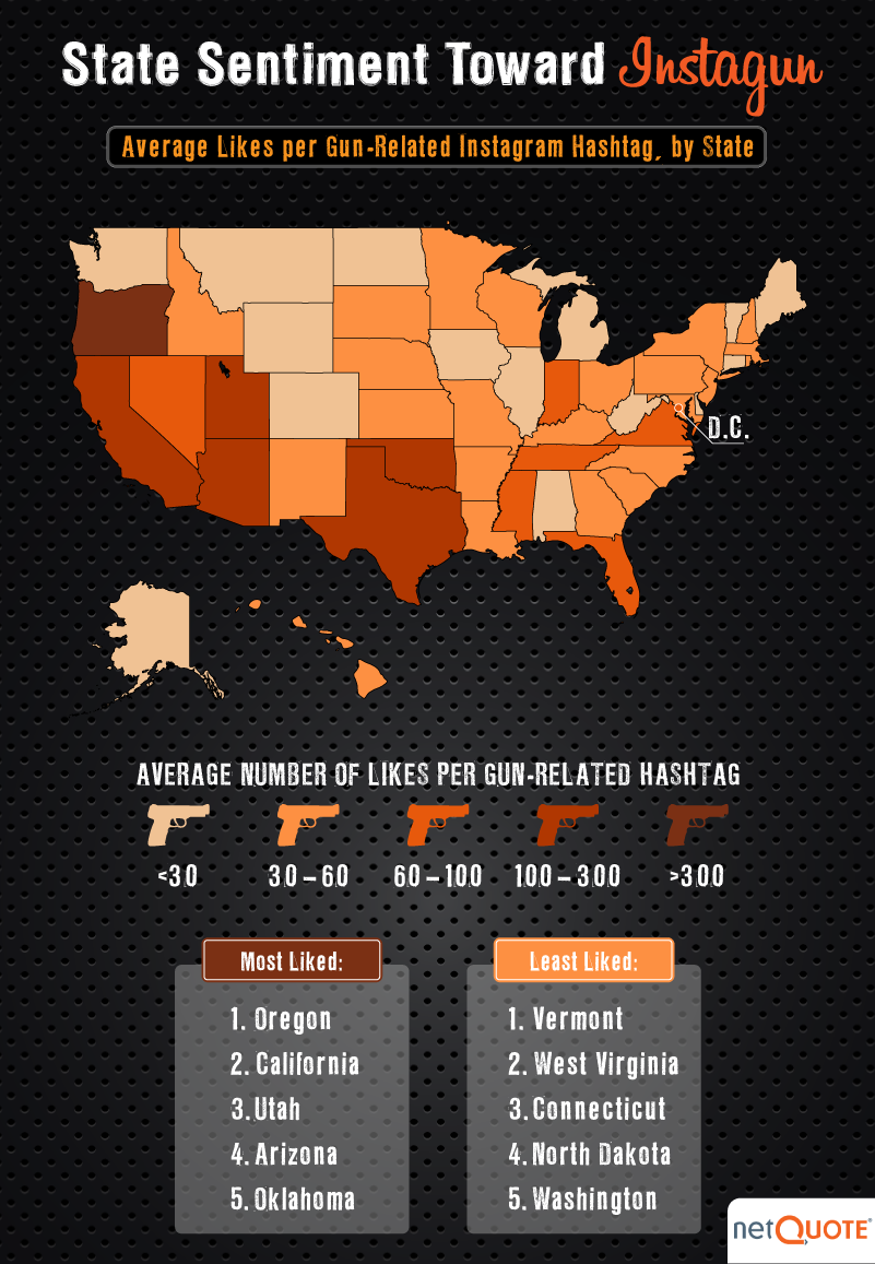 Instagram posts are nothing without their likes, and gun-related images are racking them up by the hundreds. Oregon tops the charts with more than twice as many likes per gun-related hashtag than second-place California. This may reflect, more than anything, that people are weighing in on the recent armed standoff between ranchers and the government (yes, again). As of early February 2016, the draw had resulted in one shooting death. On the opposite side of the spectrum, Vermont produces the lowest number of likes per firearm-related hashtag. Interestingly, Vermont has high rates of gun ownership. So while many Vermont residents own guns, they may be liking friends’ gun posts more on Facebook than Instagram.