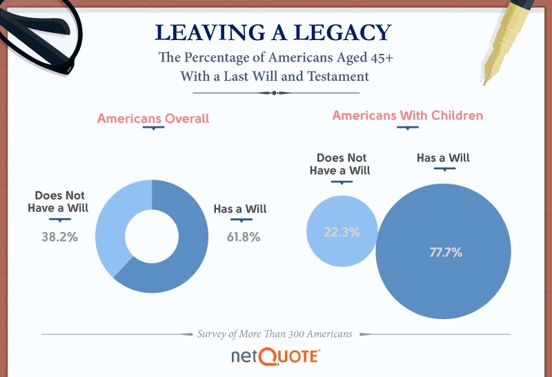 According to survey respondents, more than 1 in 3 people don’t have a will in place. However, percentages were higher among those with children — a little more than 22 percent did not have a will at the time of our survey.