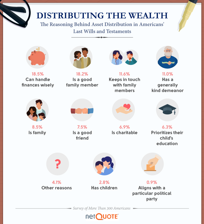 Of course, nearly 1 in 5 people distributed their possessions based on whom they thought were good family members. Nearly 12 percent said they left money to family members who kept in touch, and 11 percent arranged to leave their assets with people they found to be kind-spirited. Less than 7 percent said they were concerned with someone being charitable.
