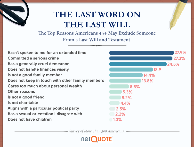 Almost 25 percent of respondents would exclude someone from their will if they were thought to have a generally cruel disposition. Other common reasons for crossing out a name included the inability to handle finances, not keeping in touch with family and caring too much about personal wealth.