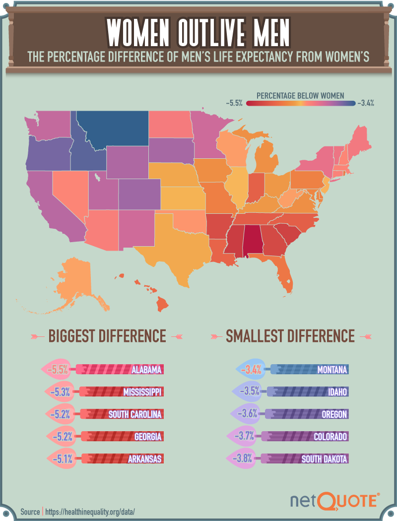 On the other side of the spectrum, Montana, Idaho, and Oregon, Colorado and South Dakota had the smallest gap between men’s and women’s life expectancy — just under 4 percent.